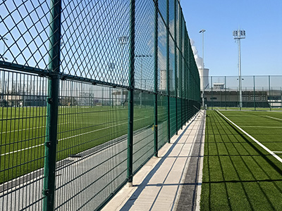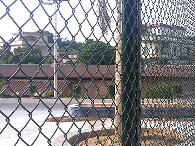 選用低碳鋼絲。 編織方法: 編織焊接而成。 規格: 1. 包塑絲經:3.8mm ; 2. 網孔:50mm X 50mm; 3. 尺寸:3000mm X 4000mm; 4. 立柱:60/2.5mm; 5. 橫柱:48/2mm; 防腐處理: 電鍍、熱鍍、噴塑、浸塑處。 優點: 具有防腐、防老化、抗曬、耐候、色彩鮮亮、網面平整,強有力張緊,不易受外力撞擊變形、現場施工安裝、靈活性強(可根據現場要求隨時調整造型和尺寸)。 可選顏色: 藍色、綠色、黃色、白色等